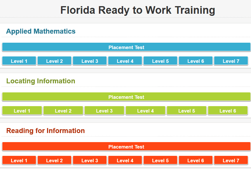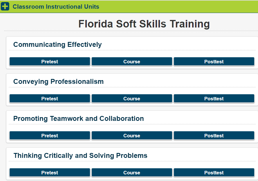 An effective supplemental instructional solution for learner success in industry certification coursework and testing, the online Florida Ready to Work curriculum provides targeted, career contextualized instruction in foundational employability skills including: